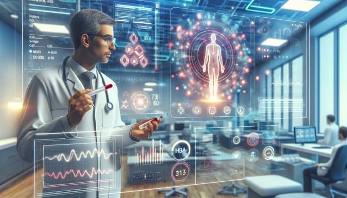 Diabetes Blood Test in Beeston: Doctor in a modern clinic holding a blood test tube, surrounded by screens showing HbA1c and glucose graphs for diabetes management.