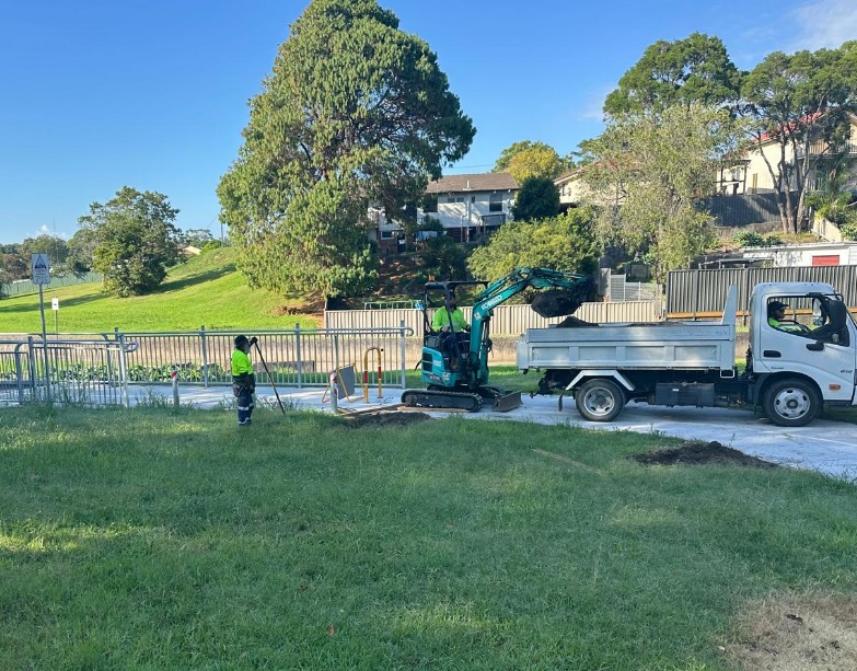 Preparing the site necessitated meticulous hole preparation, taking into account the existing path infrastructure and the need to work around various utilities. To achieve optimal planting depth and profile, we utilised a mini excavator to carefully excavate the tree pits. Subsequently, we placed each tree, backfilled the holes, secured them with sturdy stakes, and applied a generous layer of mulch. This mulch is essential as it retains moisture and suppresses competing weeds while allowing the trees to establish themselves effectively, setting the foundation for a thriving landscape.